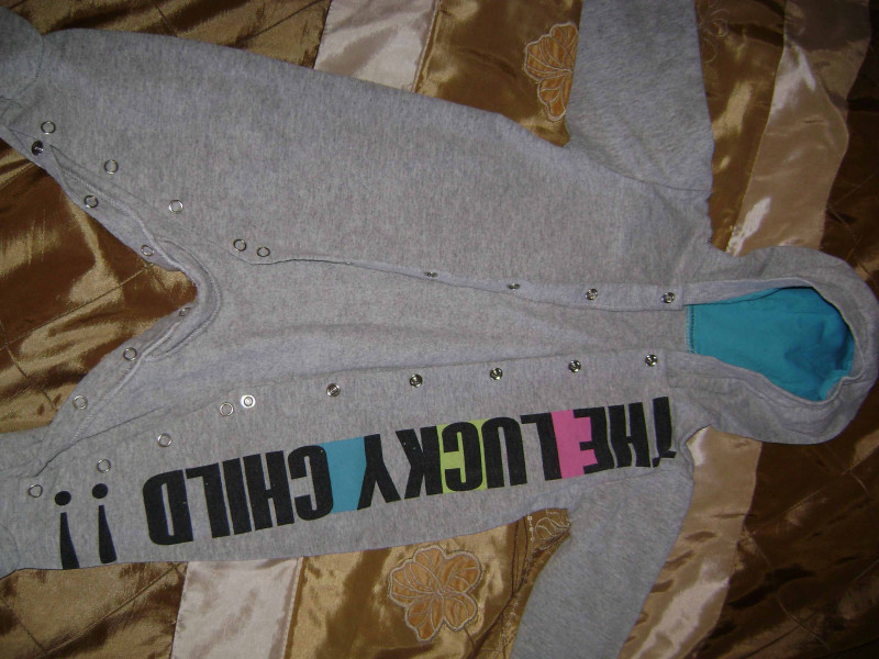2.Комбез серый с капюшоном,ткань футер,рост от 62 и до 68(хотя нам при росте 74 тоже был хорошо).Цена 150 руб(в закупке цена примерно 350).