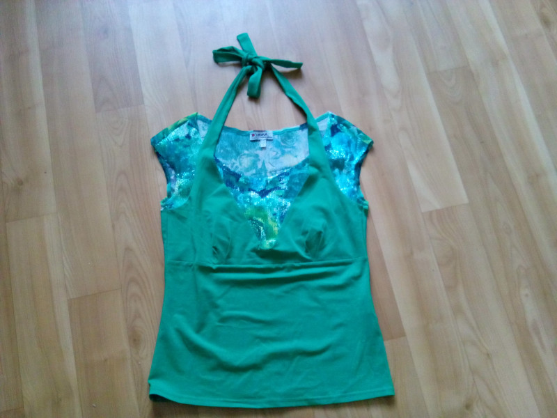 Блузка Димма, цвет бирюза (95% вискоза, 5% спандекс). Оригинальный крой создает иллюзию пары, состоящей из майки и топа, расшитого пайетками. Размер М (на 44-46), велика на ОГ 88 см. Щербинки, 400 руб.