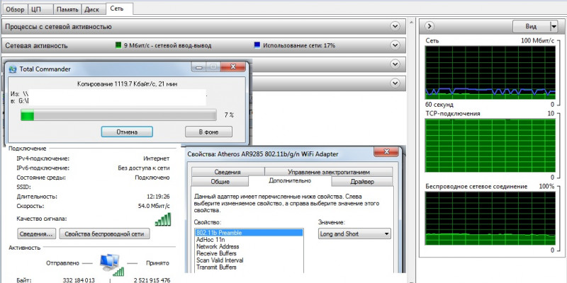Выдает порядка 10-11Мбитс при подключении 54Мбитс