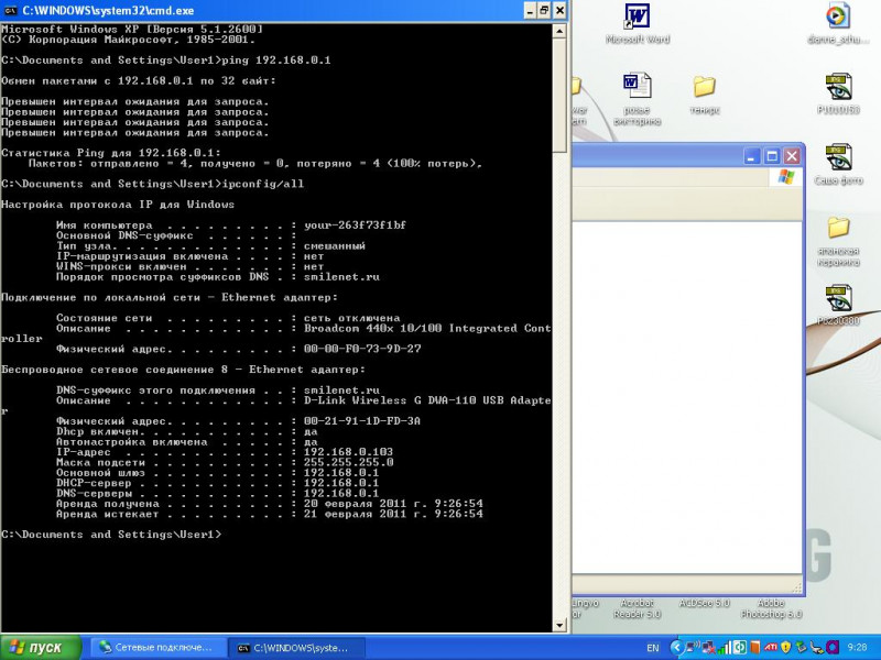 Провайдер Стрим, роутер Dlink-300, на другом конце ноут с выносным адаптером DWA-110. Показывает в трее, что связь установлена, уровень хороший, а ни один сайт не грузиццо. Пинги не идут даже с роутером (100% потеря пакетов), ipconfig/all на картинке.