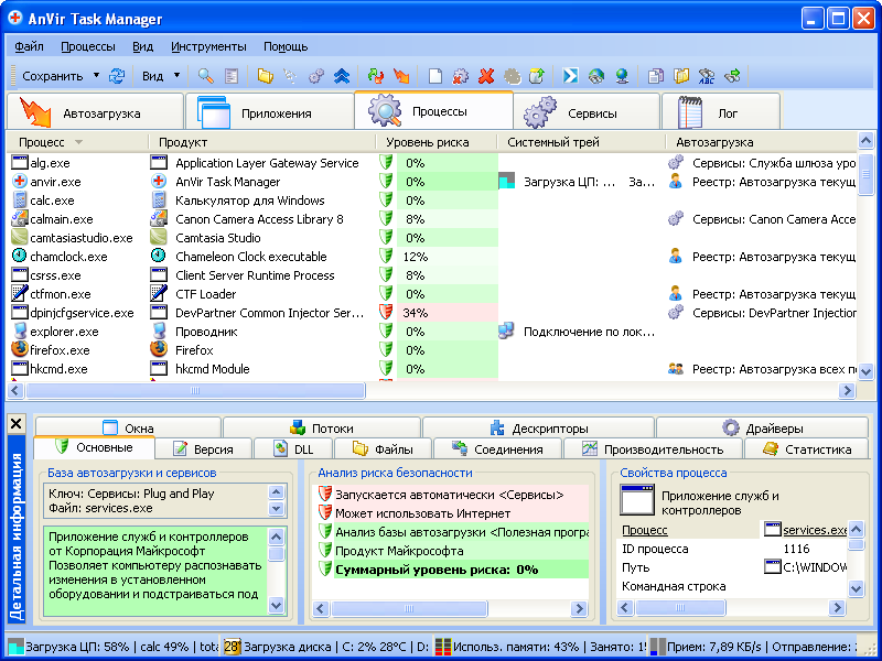 Aнвир показал сетевую активность и дал вырубить опасные процессы, которые Symantec воспринимал как безопасные.