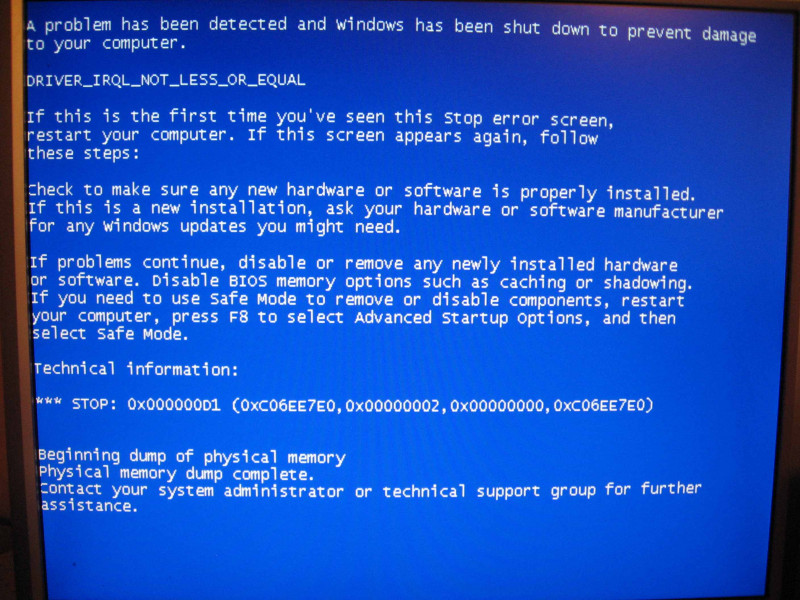 мульон причин, какая из них верная?причем полного соответвия 0x000000D1(0xc06ee7e0..) я так и не нашол..но если стоит sp1 или sp2 то в любом случае будет не плохо его обновить
