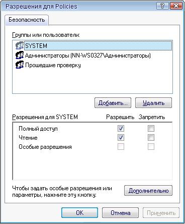 Разрешения остались теми же, что я прописал, т.е. у SYSTEM - только чтение, лок. админы - полный доступ.