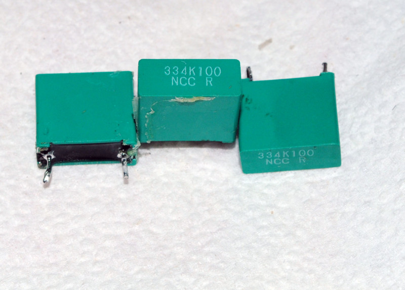 Уже разобрался, как подсказали на другом форуме это полистирольные или лавсановые кондеры 0.33мкф 100в, и действительно не текут. Заменить можно на К73-17.