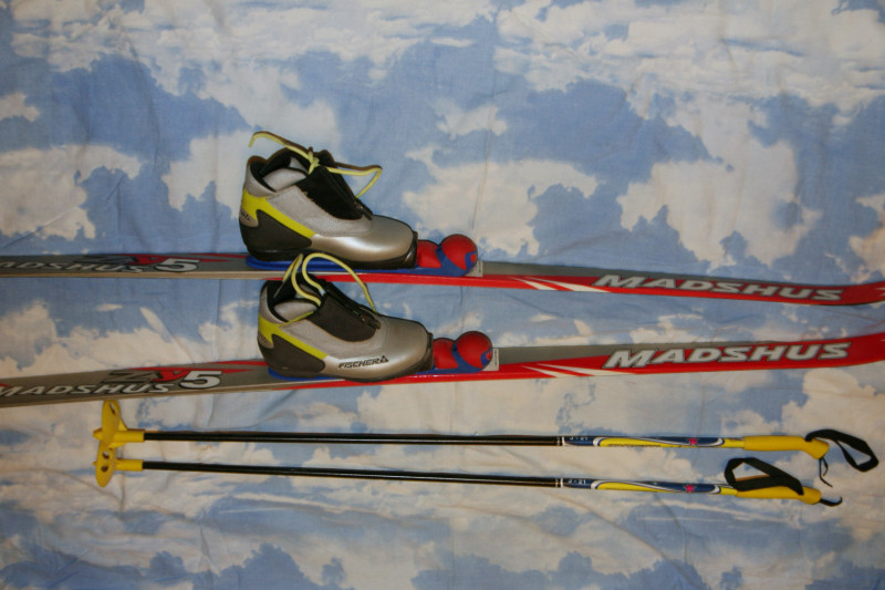 5) Лыжи беговые детские MADSHUS пластиковые с насечкой 130 см + крепления + палки + ботинки FISCHER размер 31 европейский. Катаны раза 2. Не пошло у нас это дело. Ну, пусть будет 2 тр.