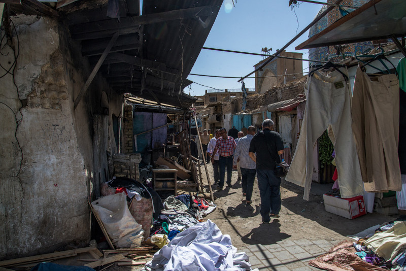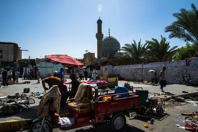 Отель явно лучше, чем в Наджафе, а завтрак - так вообще несопоставим, наедаемся от пуза. Адам назначает выезд на 10:30. В назначенное время выходим, и садимся в микроавтобус. Некоторое время едем шустро, но на подъезде к старому городу вязнем в пробках. Нас высаживают в самой старой части Багдада, неудивительно, что сейчас здесь рынок. Везде - множество чек-пойнтов, при проходе в любое мало-мальски заполненное народом место приходится проходить процедуру обыска с ощупыванием и предъявлением сумки в открытом виде. Сегодня пятница, и множество людей устремляется после обеда в мечети на пятничную молитву.