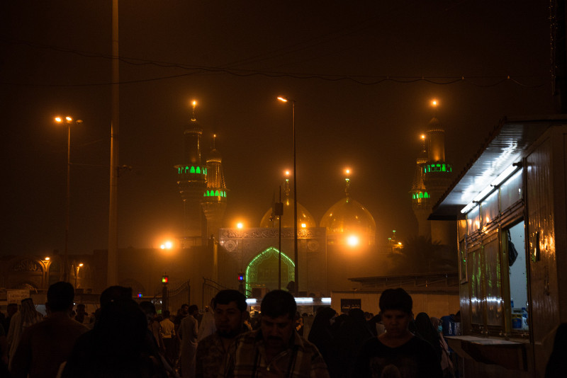 В 6 вечера собираемся и до-олго едем по вечернему Багдаду. Жуткий трафик, многие улицы перекрыты. Адам везёт нас в район Кадимия. Там очень популярное место вечернего отдыха горожан, поэтому и меры безопасности приняты повышенные. Дополнительные блок-посты на въезде, плюс ограничивают количество такси, разрешая проезд только тачкам с дополнительным допуском. Поэтому приходится выйти, пересесть на автобус-челнок, который доставляет нас к началу полностью пешеходной зоны. На входе - ещё один блок-пост, привычно подставляемся под поверхностный обыск и раскрываем сумки для полного досмотра. Народу действительно тьма тьмущая. В воздухе традиционно висит пыльное марево, в которое органично вливается дым от множества жаровен, на которых делают шаурму, готовят кебабы и прочие радости гурмана. Делаем остановку, чтобы выпить по фрешу из дынь и гранатов. Божественно, и стоит всего 1000 динаров (меньше доллара).