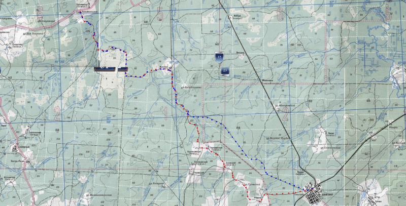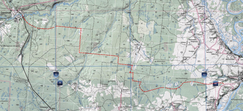 Поэтому есть другое предложение - Красносельское-Шайгино через д. Журавли. Два дня с раннего утра до позднего вечера, всего 32-35 км, дороги на снимках в основном просматриваются. Во второй день можно пройти через урочища на месте бывших деревень, можно просеками.