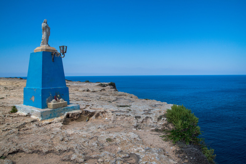 Оттуда поехали на северную оконечность острова - на мыс Ахраш. Сначала заглянули к статуе Мадонны - небольшая скульптура стоит на продуваемой всеми ветрами голой скале, обрывающейся тридцатиметровыми обрывами в море. Судя по мемориальной доске, как минимум один человек трагически погиб, оступившись на обрыве.