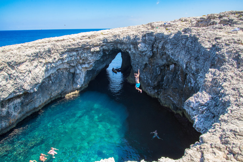 Потом поехали на сам мыс. Можно доехать практически до места, если свернуть на последнем повороте дороги налево, по указателю на кемпинг. Помимо видов на Гозо и Комино, на мысу меня привлёк ещё один чрезвычайно интересный природный объект - провал в скалах, про который в путеводителе было написано следующее: "Остерегайтесь огромного провала овальной формы длиной примерно 25, и шириной 14 метров, в глубинах которого поблескивает темная вода". Я, конечно же, сразу же взял и провалился)). На самом деле с посещением нам очень повезло - какие-то ребята, судя по говору, из Америки, снимали там TV шоу - двое парней прыгали в провал с высоты около 10 метров (оператор сказал - примерно 40 футов, но, на мой взгляд - чуть поменьше). Естественно, что мне тоже захотелось. Открытым оставался вопрос - как выбираться, спросил у ребят об этом, на что они мне ответили, что если я не буду жевать сопли и спрыгну в течение 5 минут, то плавающий внизу страхующий на каяке без проблем подхватит меня на буксир и вывезет оттуда. Провал соединён с морем узкой подземной расщелиной, вокруг отвесные скалы, и до ближайшего места, где можно вылезти на берег, достаточно далеко. Несколько смутила глубина внизу - со слов ребят, в самом глубоком месте было всего около 3 метров (а это на грани безопасности), но я своими глазами видел, как только что двое парней сиганули вниз, и решил, что все-таки там несколько глубже. Вообще, конечно, здорово, что мы попали туда как раз в это время - без примера перед глазами я бы точно не стал прыгать. Очко сжалось до пары микронов, но, вспомнив прыжки в молодости в бассейне с десятки, я таки сделал это. Все прошло чисто, в воду вошёл хорошо, дна не достал. Ещё через пять минут уже вылезал на берег (тапочки абсолютно необходимы - острейшие скалы). Определённо день уже прошёл не зря!