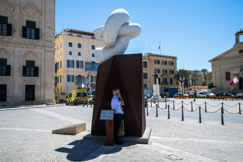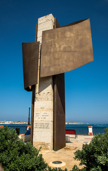Это было последнее маст си, которое я планировал посетить. Дальше просто поехали вдоль побережья, заезжая во все упомянутые в путеводителе места. Первой такой локацией был памятник окончанию холодной войны, воздвигнутый по мотивам встречи на Мальте в 1989 году Горбачёва и Буша. Из чтения путеводителя я почему-то решил, что будут хотя бы их скульптуры, поэтому слегка разочаровался, увидев невзрачную ржавую конструкцию с надписями на английском, русском и мальтийском языках.