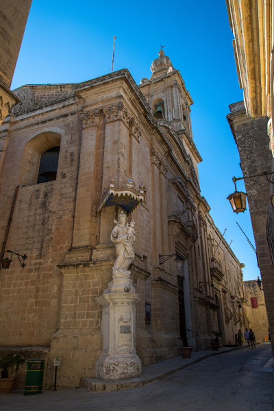 Огромный паркинг перед старым городом бесплатен. Мдина, пожалуй - наиболее сохранивший в себе средневековые черты город. Узкие улочки... Путеводитель пишет, что это единственный старый город на Мальте, к строительству которого почти непричастный рыцари ордена. Крепость построена... да фиг знает, когда. Ров вот вырыт ещё в IX веке арабами, а вот крепость, подозреваю, сильно пострадала во время сильнейшего землетрясения 1693 года и потом восстанавливалась. Магистр Вильен устроил в 1724 году новые триумфальные ворота в крепостной стене, заменив ими простенькие старые, с подъемным мостом, контур которых хорошо заметен метрах в четырёх справа.