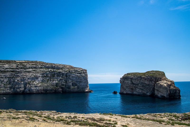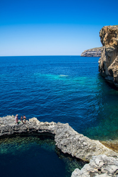 Следующая точка - скопление всех природных достопримечательностей Гозо, побережье западной части острова, Дуэйра. Ещё несколько месяцев назад тут располагалась, пожалуй, основная достопримечательность страны - огромная арка Голубое окно, но один из штормов доконал её. Вообще за последнее время природным сайтам в виде арок сильно не прёт - помимо Голубого окна, совсем недавно обрушилась ещё и знаменитая "Слоновья нога" в Легзире в Марокко, и ни одну из них я так и не успел увидеть. Помедитировали на остатки, пофотографировали окружающие рельефные скалы и темно-синюю "Голубую дыру", в которой роились обучающиеся дайверы. У меня сложилось впечатление, что туда вполне можно махнуть с карниза наверху - высота никак не выше, чем позавчера. Единственное "но" - надо допрыгивать, метра 3, а значит, риски повышаются. Но это я так, для тех, кто захочет попробовать