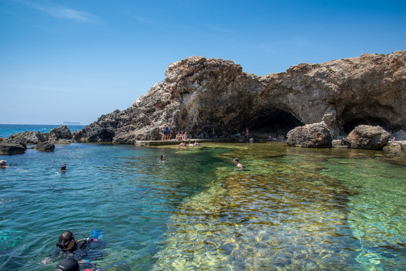 Зато никуда не делось "Внутреннее море" - небольшая лагуна, соединённая с открытым морем масштабным тоннелем длиной метров 150-200. Я сплавал туда-обратно своими силами (заколебался от шныряющих взад-вперёд лодочников уворачиваться), а жену потом тем же маршрутом свозили за 4 евро, бонусом покатав вдоль побережья ещё минут 15. Она же снимков и наделала.