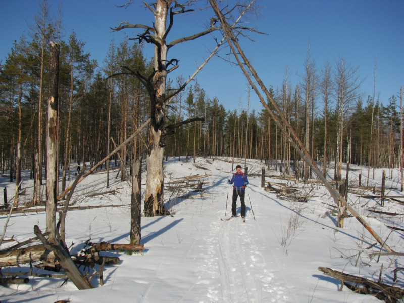 Начав путь от " Логопрома " , под первый утренний лай собак , оставляя кладбище по правую руку , - легко скользил по пушистой снежной крупе . Громадная залысина после пожаров местами засеяна и уже видны крошечные ( ниже колена ) деревца с иголками . На длинных , 5см ширины лыжах наст держал прекрасно ! Иногда пробовал наст ботинком - на цыпочках идти можно , но резкий пролет ноги под корку заставлял вспомнить русский , иногда разговорный язык . Направо , налево , вот сюда - куда угодно можно направить лыжи по насту . Впереди низина с мелкими кустиками , следами кого? , и карликовыми сосенками - Карелия! , думал я , никогда небывавший там :) . Заглянул на березовую аллею , которая до пожаров приводила в трепет сердце - его защемило :( .