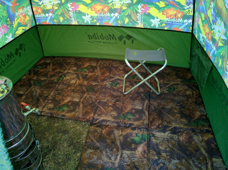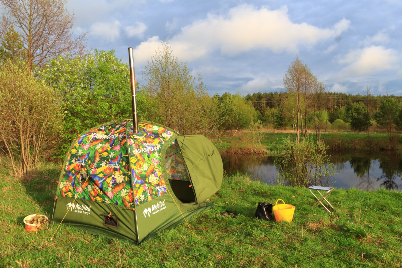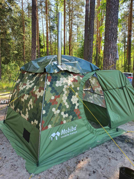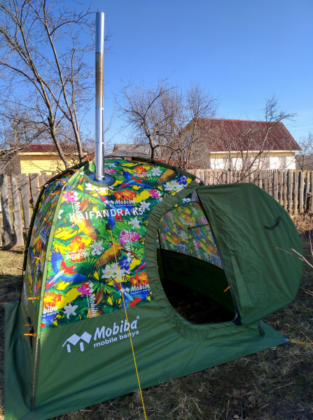 Кайфандра однослойная (хотя можно докупить тент с тамбуром), печь без камней, но с парогенератором - жарко, пока топишь. Зато собирается и разбирается быстро (10-15 минут), общий вес с допами килограмм 17. В качестве походного варианта самое оно. В качестве полустационарного, наверное, лучше выбрать другие модели Мобибы.