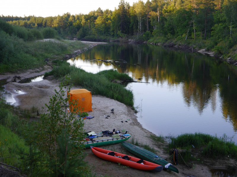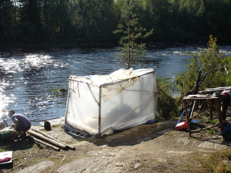 В походе по Керженцу используем обычно два тента, пленку пару раз использовали дополнительно, соответственно, тенты сматываем и забираем, пленку также. После нас остается каркас из веток, камни также забираем, везем на место второй бани, там по-разному, когда бывает закапываем, когда и нет. Каркас в паводок смывает, по крайней мере, ни разу не видели своих бань в следующих походах, камни рыбаки растаскивают, часть песком замывает в паводок, камни на месте второй бани все же находим на следующий год.