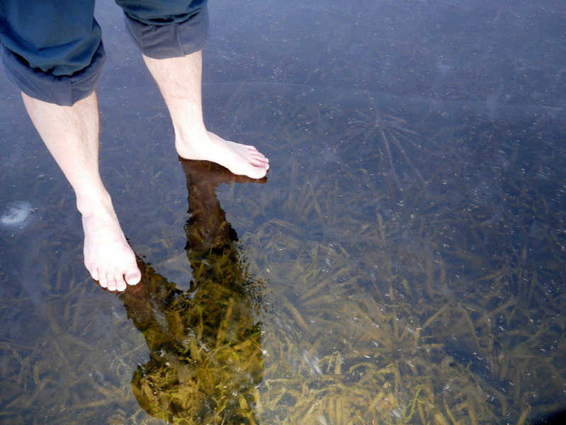 Типа, такая практика закаливания. На самом деле это не на столько сурово, как кажется. Если загуглить, в Москве/Питере довольно много народу ходит босиком вообще круглый год.