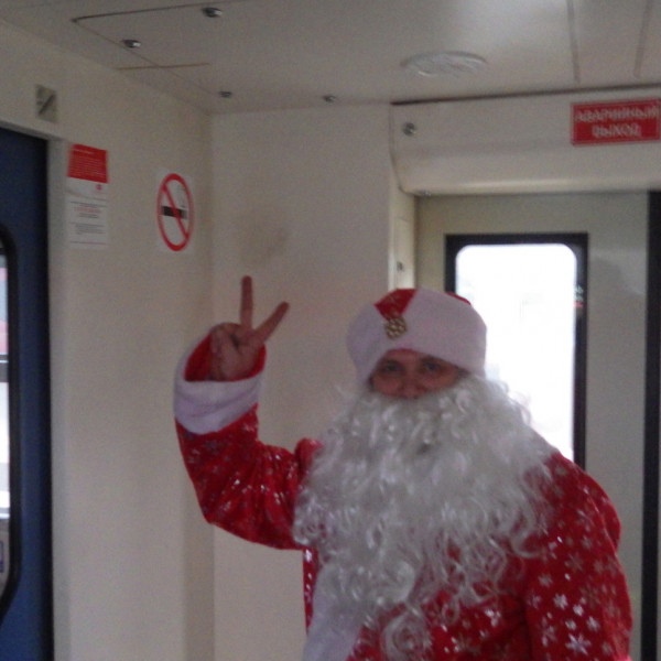 Дед Мороз пел песни пассажирам. Тем временем, Снегурочка/проводница проверяла билеты... :-)