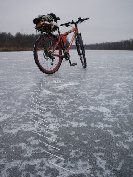 Пользуясь льдом всё Юхро изъездил на велике:)
