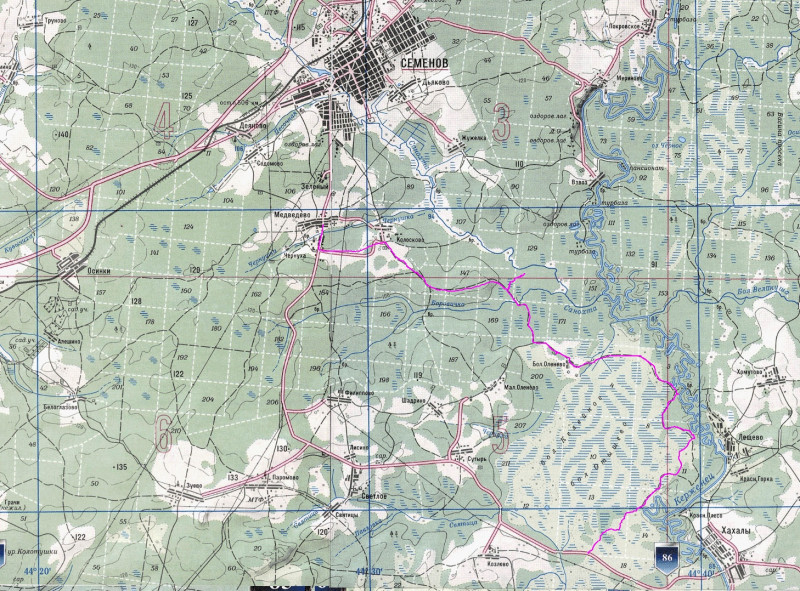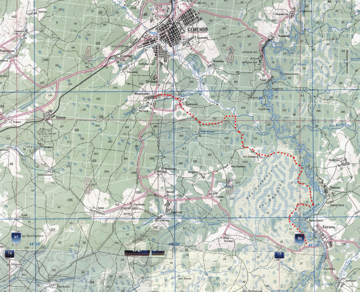 Приблизительный трек на картинке. Заброска электричкой НН-Семенов 6:10 - 7:20 + автобус Семенов - Хахалы 7:30 - 8:30