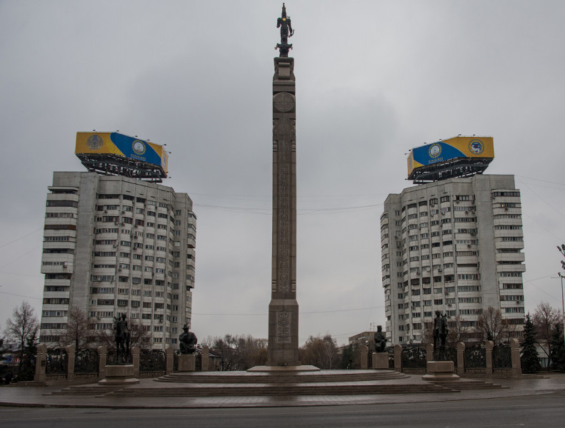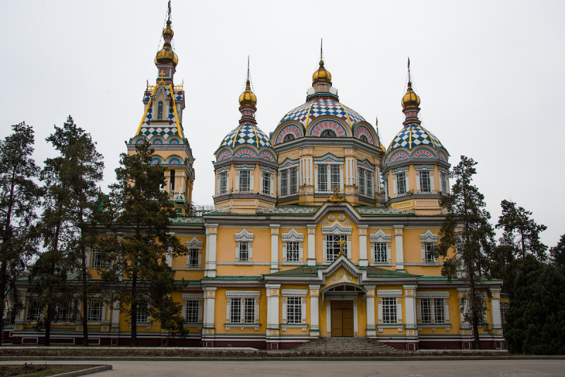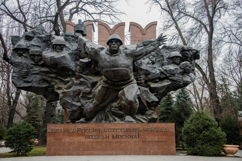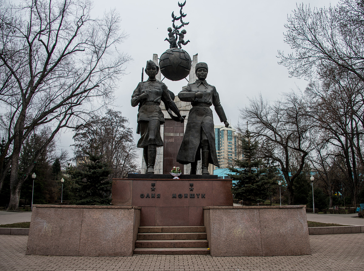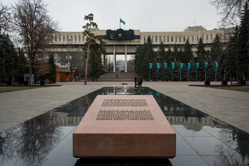 В первый день встали в 11 по местному времени (разница с Москвой - 3 часа), и поэтому занялись осмотром города. С историческими достопримечательностями в Алма-Ате по понятным причинам совсем негусто (город основан всего в 1854 году), поэтому фактически просто гуляем, обходя то, что есть. Сначала заглянули в парк 28 панфиловцев, благо, это в 3 кварталах от нас. В парке - мемориальный комплекс и вечный огонь, посвященный, само собой, 28 панфиловцам и всем погибшим в ВОВ...