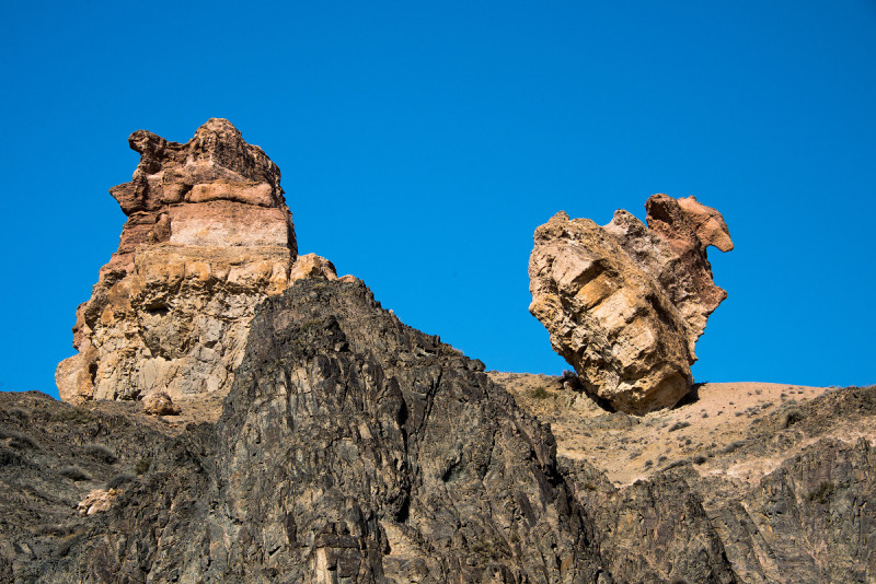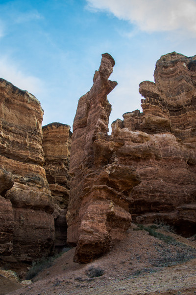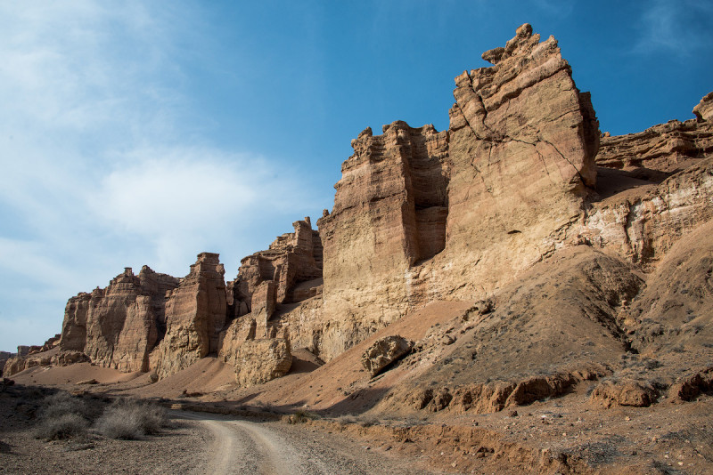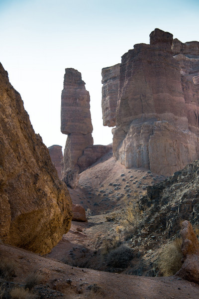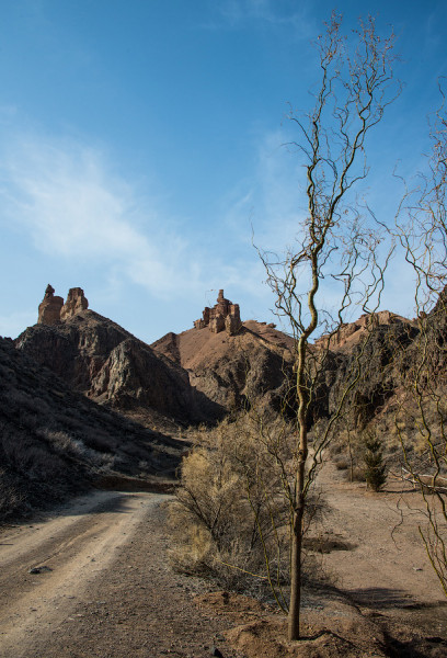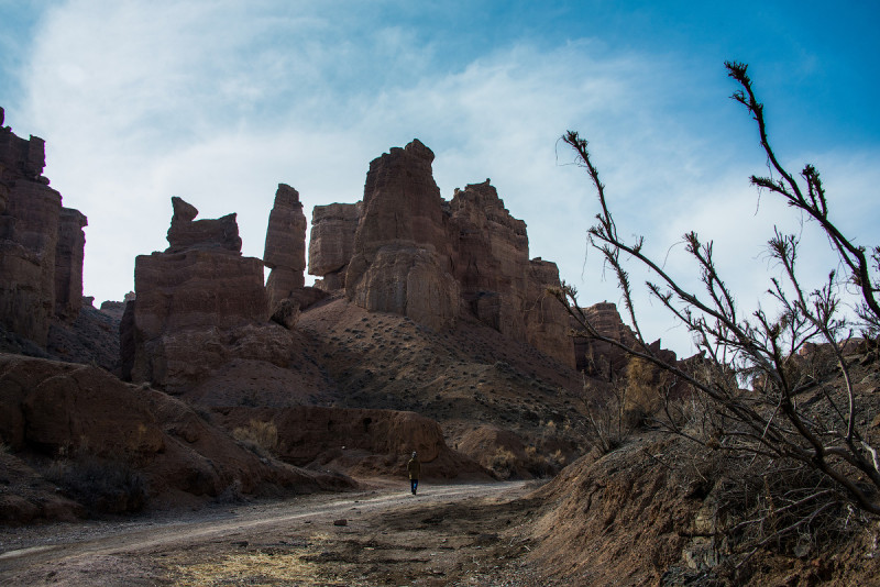 Чарынский каньон тянется почти на 150 км, но основные красоты - здесь, в долине Замков протяженностью около 3 км. Можно съехать вниз, но только на более-менее серьезной машине с высоким клиренсом и полным приводом. Впрочем, паркетники наружу в итоге тоже выбираются, оставляя на память каньону куски защиты и пластикового обвеса, иногда получается только с помощью УАЗа местных работников. Прочитав в отчетах, что в конце долины Замков можно спуститься вниз, я сразу же взял это на вооружение. Итак, сначала идем поверху, делая короткие вылазки в сторону на великолепные естественные смотровые площадки на верхушках торчащих останцев; в конце спускаемся, и обратный путь проделываем по дну каньона.
