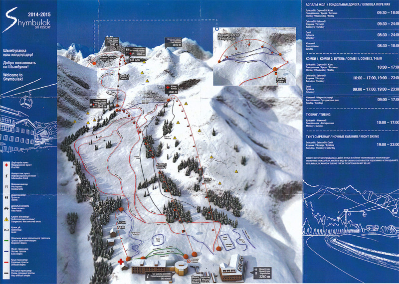 Поскольку сайт курорта полузаброшенный (по крайней мере, инфа там обновляется раз в два-три месяца), стоит привести ссылку на фейсбук, где реально регулярно отписываются по состоянию склонов, мероприятиям и т.д.: https://www.facebook.com/pages/Shymbulak-Ski-Resort/108561005881215?fref=photo