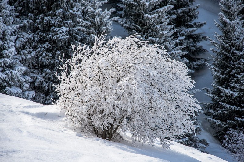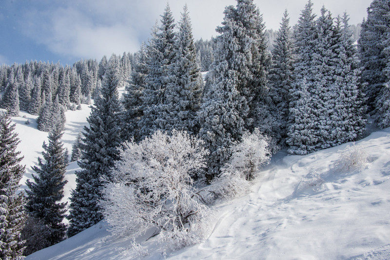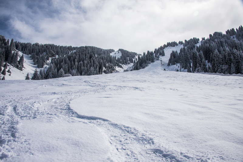 К моменту нашего первого спуска количество свежих следов на склоне равнялось четырём штукам. Совершив пару ознакомительных проездов (всё-таки снежка выпало мало, чтобы полностью нивелировать застарелые бугры и расколбас), уходим налево, за флажки. Ба, да у них тут везде газексы! Ну точно, денег не жалеют. За флажками - классный снег, правда, стоят таблички <<лавиноопасно!>>, видны следы старых сходов, но снег лежит вроде надёжно, никаких признаков нестабильности. Тем не менее, стараюсь быть предельно аккуратен, избегая места, могущие послужить спусковым крючком. В общем, спустившись по разу по трём имеющимся чёрным трассам, остальное время раскатываем великолепную целину. В отличие от Чимбулака, здесь возможностей для фрирайда хоть отбавляй. Влево можно траверсить прямо от верхней станции креселки, имея в своём распоряжении почти километровый склон. Если же подняться ножками буквально на 40-50 метров вверх, то будешь стартовать прямо с гребня, что даст довольно весомое преимущество по высоте старта по сравнению с траверсом от верха канатки. Справа от креселки - аналогичная картина, только лес гуще. Можно уходить не меньше, чем на километр, и всё равно выкатишься прямо к подъёмнику, никаких проблем. Идеально!