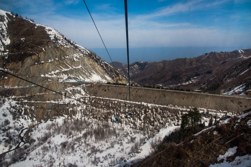 Самая нижняя очередь - кабинки, предназначенные для заброски как катающихся, так и экскурсантов к нижней станции горнолыжного комплекса, трасс под ней нет. Зато открывается великолепный вид на высокогорный каток Медео (это словосочетание я помню еще с советских времен).