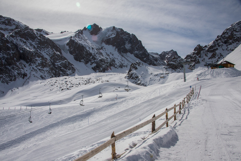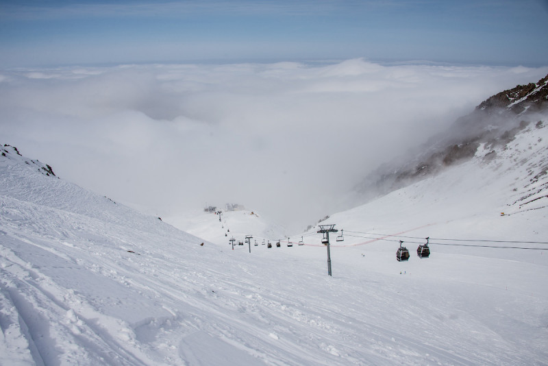 Пока же ничто не предвещало такой радикальной смены погоды, и мы катались в своё удовольствие. И первая, и вторая очереди на Чимбулаке - четырёхместные кресла вперемешку с кабинками, потому что довольно много желающих подняться на Талгарский перевал без лыж, просто ради вида. Креселка ККД-4 (Quad) работает только в выходные, но по большому счёту, не больно-то она и нужна, практически к её верху можно попасть траверсом от нижней станции Комби 2, особенно если разогнаться посильнее. Трассовое катание отличное - всё идеально подготовлено ратраками, а, учитывая незначительное количество народа, вельвет местами сохраняется до середины дня. Перепад высот более чем приличный - с 2260 м на нижней станции до 3180м наверху, на Талгарском перевале.