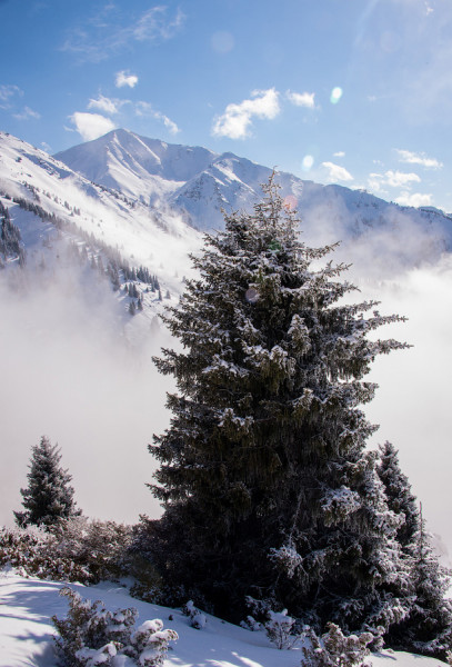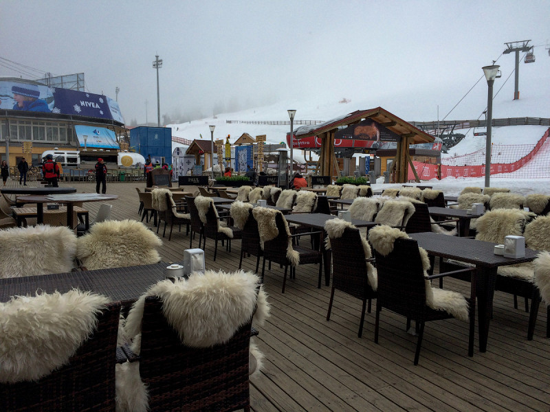 Вообще в весь комплекс во время подготовки к Зимним азиатским играм в 2011 году вбухали немеряно бабла - несколько сот миллионов долларов, теперь тут всё новое и красивое: канатные дороги Leitner, ряд о-очень богатых гостевых коттеджей у нижней станции Чимбулака, дорогущий отель. Насчёт дороговизны у меня суждение косвенное, основанное на ценах в ресторане при отеле - когда на гору село облако, жена решила испить чайку, но, ознакомившись с ценами, передумала. За стаканчик чая с небольшим кусочком торт Медовик тут хотели почти тысячу рублей (2800 тенге)!