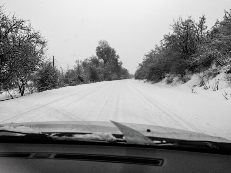 На ещё вчера сухой дороге снежная каша, видим, как едущую впереди машину разворачивает и выкидывает на встречку. Хорошо, что без последствий. Через 43 км сворачиваем с Кульджинского тракта на Есик. Каша под колёсами моментально сменяется чудовищно скользким накатом и скорость падает до 40-50 км в час. Видимо, основные дороги чем-то посыпали, а до второстепенных руки ещё не дошли. На подъёмах попадаются съехавшие в кювет или бесполезно шлифующие дорогу машины - похоже, что кое-кто уже поменял резину. У нас шипы, но всё равно о-очень скользко. Перед Тургеном нужно свернуть направо, на совсем уж завьюженную и неезженную дорогу.