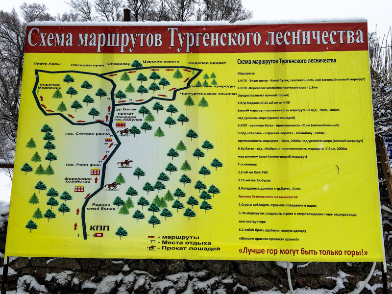 Выглянув с утра в окно, не поверил глазам - за ночь Алма-Ата укрылась десятисантиметровым слоем снега. Сейчас он активно таял, но в горах наверняка лежало сантиметров 15-20 свежачка. С этими приятными мыслями собрались и около половины девятого выехали в путь. Почасовой прогноз обещал с утра пасмурную погоду, а вот после обеда должно было появиться солнышко, поэтому сначала отправились на Тургенские водопады, расположенные дальше Ак Булака, но в том же направлении. Помня о здешних суровых ПДД, я крался по городу так, что было аж самому противно. Вообще сложилось впечатление, что многое в Казахстане перенимают от нас, а кое в чём и опережают, по крайней мере, фишки одни и те же. Например, Казахстан некоторое время на пару с Россией был одной из двух страной, в которых законодательно не был установлен лимит содержания алкоголя в крови/выдыхаемом воздухе. В России, слава богу, этот соблазн для разводов убрали, а тут всё по-прежнему, и я рулю, с опаской вспоминая выпитые накануне 200 граммов рома. Хорошо, что номера на машине местные, и я не привлекаю внимания. Доверенности недавно отменили, как и у нас, а вот с официальной продажей <<красивых>> номеров казахи нас опередили, и покупка заветной для некоторых железяки с цифрами вида 00Х будет стоить от 2000$ в зависимости от того, чему равен Х. В отделениях на местах висят официальные прайсы.