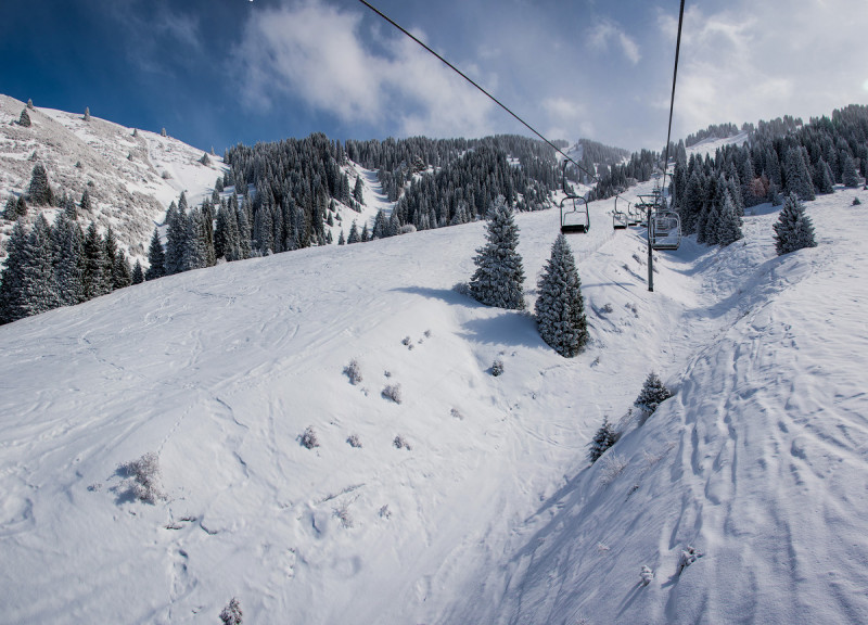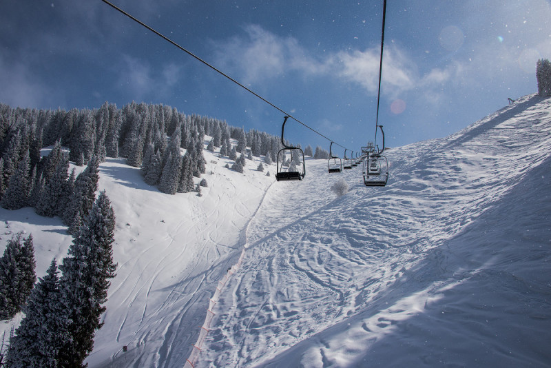 Масштабы комплекса внушают уважение. Тут и каток, и гостиница с коттеджами, и боулинг, и, наверное, дофига чего ещё, но въезд в горнолыжную часть курорта обособлен, поэтому подробное знакомство не состоялось. Со слов местного сотрудника, комплекс принадлежит АО НК КазМунайГаз - этакому казахскому аналогу Роснефти и Гапрома, вместе взятых. Я уже не удивляюсь, что вдоль всех парковок проложены травалаторы длиною метров 300, чтобы подниматься к нижней станции подъёмника прямо на лыжах. Правда, сейчас они не работают, что, впрочем, оправдано - наша машина седьмая на многоуровневой парковке, а число катающихся на огромной горе не превышает на глаз 20 человек.