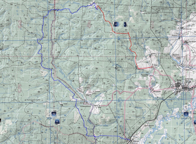 Показанная на карте дорога от ур. Каменное в сторону Бархатихи заросла до степени неотличимости от окружающего ландшафта. Реально ездят верхней дорогой до пересечения с лесовозкой, а потом на юг. У лесовозного моста через Березовку две эти дороги сходятся. Пока лезли через лес напролом, наблюдали чумового зайца. Для него, похоже, все то что не шумит - не существует. Убежал только тогда, когда у меня ветка под ногой треснула.