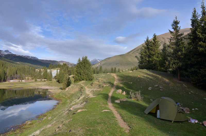Как ни странно, дошлёпали относительно быстро, за час с копейками, по пути развлекаясь фотоохотой на сусликов. Озеро с трех сторон окружено лесом, и в вечернем свете весьма симпатичное. Бросились к нему после дорожной жары как к оазису в пустыне ) Обнаружив на ближайшем лесистом берегу уютную стоянку, группа предалась релаксу, а я предался фотоохоте на местную флору, среди которой, помимо вездесущего первоцвета холодного и великолепного Первоцвета тяньшанского, было сразу же обнаружено еще несколько новых для меня видов. Пока я за ними гонялся, группа успела отдохнуть и разбрестись - кто пошел обратно в лагерь, кто отправился вверх по тропе плановой радиалки, быстро исчезнувшей в густом арчевнике. Пытаясь догнать последних, пробежал за ними еще километра два и набрал 200 метров высоты, но безрезультатно, поэтому тоже повернул в лагерь. К наступлению темноты группа собралась в полном составе и за ужином наши путешественники взахлеб рассказывали про красоты, которые открылись им выше кустарникового пояса, включая альпийские луга, величие гор и стада непуганных яков. Пожалели, что не получилось полноценно сходить туда в радиалку, ну да делать нечего, как-нибудь в другой раз.