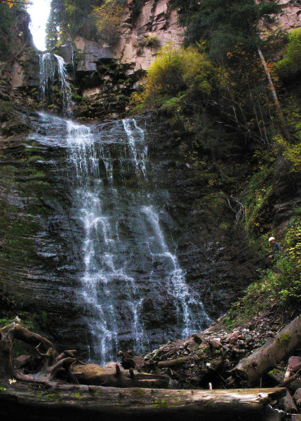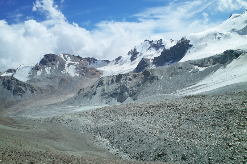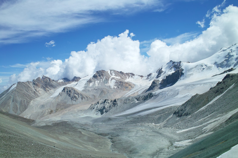 Утром, позавтракав и собрав лагерь, около девяти отправились в короткую, буквально двухчасовую радиалку вверх по ущелью. Практически сразу начался дождь ("хорошо, что на перевал не пошли, нечего там в такую погоду делать!"). Дорога везде хорошо наезженная, но выше альплагеря завалена упавшими елками, и уже начинает зарастать. Река в районе завала растекается сетью проток по широкой долине, но вскоре снова собирается в единое русло. Между тем, дождь закончился и снова выглянуло солнце ("может, зря не пошли на перевал?...").