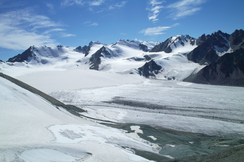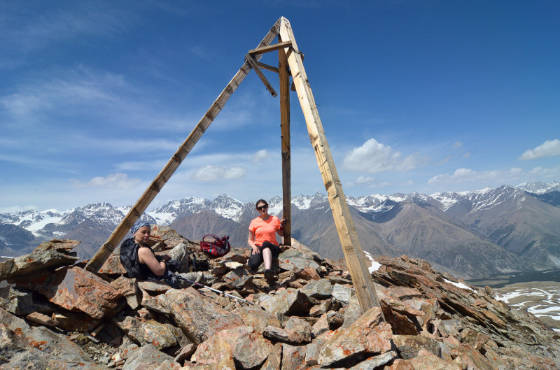 Поскольку до верхнего озера (от которого планировалась пешая радиалка в сторону перевала Ак-Суу (15 км в один конец) от нашего лагеря оставалось еще около 10 км, планы пришлось переиграть, и вместо перевала Ак-Суу (4052 м) отправились на перевал Кум-Бель (3590 м). Радиалка получилась довольно непростая. Во-первых, недосып после авиаперелета и приличная стартовая нагрузка на еще нетренированные организмы. Во-вторых, довольно быстро обгорели на яром иссык-кульском солнце. Наконец, последние несколько километров до седловины перевала (а мы поднимались на него по северному склону) были покрыты сплошным снегом, рыхлым и сырым, толщиной от метра и более - и палки, и ноги проваливались в него на всю глубину, продвигаться было очень трудно. По этой причине приняли решение выбираться на хребет и по его ребру идти не на перевал, а сразу на одну из вершин к западу от седловины. Сыпуха всех видов, плюс грязь и местами полосы снега, но кое-как добрались. На вершине стоит геодезическая вышка (т.н. триангуляционный знак) в виде треноги, высота 3707,5 м. С вершины можно наблюдать Иссык-Куль и даже можно пытаться разглядеть горы на его южном берегу (хотя ширина озера в этом месте почти 60 км!). Также, по пути на вершину удалось глянуть и перевал Ак-Суу - весь его обращенный к реке склон также представлял собой снежную стену - так что, может, и хорошо, что машина нас туда не довезла )