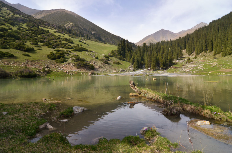 Покинув Григорьевскую щель, дорога выходит в высокогорную многокилометровую степь (представляющую собой одно сплошное пастбище, по которому тут и там разгуливают стада коров и отары овец) и сразу же разделяется. Направо уходит (через небольшой перевал) перемычка в соседнее Семеновское ущелье, налево - дорога в очередной раз пересекает по мосту реку Чон-Ак-Суу (Большая белая вода) и следует вдоль нее до самых верховьев, становясь все менее проезжей для нашего недопривода. По пути имеются три озера. Нижнее, или первое (сравнительно большое) - популярное место для отдыха. Большинство участников летних коммерческих автоэкскурсий по Григорьевскому ущелью (из числа отдыхающих на Иссык-Куле) не заезжают выше него. У нас же изначально в планах было доехать до верхнего (третьего) но машина смогла довезти лишь до среднего (да и то, с превеликим трудом, и уже почти в темноте). На его берегу и поставили наш первый лагерь. Вполне обжитая стоянка в еловой рощице (надо признать, местная тяньшанская ель - а все леса там состоят исключительно из нее - в плане комфорта стоянок ничуть не уступает нашей сосне, на земле шишки и сухая хвойная подстилка (никакого тебе мха и кустарничкового яруса, столь характерного для наших сырых ельников), из-за чего не покидает ощущение, что находишься в сосняке)