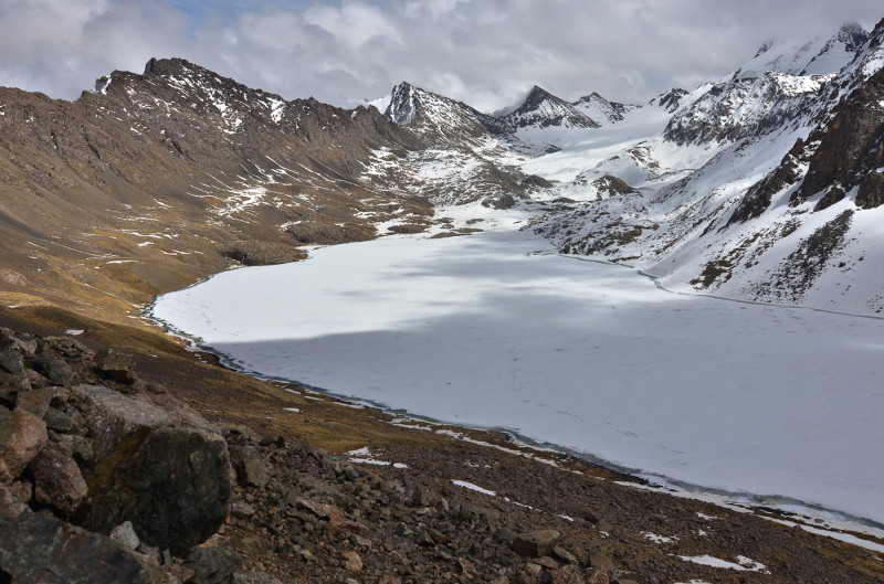 Как и сказал одинокий идальго, озеро еще подо льдом. А лед под снегом ) В общем, не покупаешься. Да и не пофоткаешь толком - все равномерно белое. А так надеялись, что застанем момент распаления льда и пестрые орнаменты проталин! Увы, сплошной лед, и таять даже не собирается. Правда, в одном месте у берега была замечена небольшая полынья - при желании можно было бы пополнить запасы питьевой воды, но у нас ее пока было достаточное количество (из-за хмурой промозглой погоды пить не сильно хочется), поэтому встали на перекус прямо у скального перегиба, спрятавшись от ветра за большие камни, и наслаждаясь видом на озеро и на окружающие заснеженные вершины. Вскоре показалось солнышко, и немного подсветило озерную гладь, благодаря чему (а может, вследствие появления робкого чувства сытости) жизнь снова заиграла всеми красками. Полусерьезно поинтересовался у команды: "На перевал-то пойдем?". На что неожиданно получил почти мгновенный ответ "Конечно, пойдем!". "Но вообще, до него еще 2,5 километра скакать по камням и почти 400 метров набора высоты", - попытался было урезонить я их эйфорию. "Всего 2,5?!! Всего 400?!! Да это же ерунда!!".