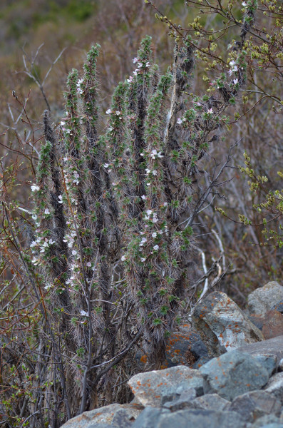 Как в Григорьевском ущелье Оксиграфис ледниковый, а в Семёновском - Кортуза Бротеруса, так и в Каракольском было свое фирменное растение, которое до этого нам нигде больше не встречалось. Произрастало оно исключительно в районе приюта "Сирота" и представляло собой высокие мохнато-шипастые кактусообразные стебли, покрытые крупными белыми и розовыми цветками мотылькового типа. Росло густыми зарослями вдоль тропы. Пока шли туда, было туманно и моросил дождик, да и света было мало, поэтому фоткать не стал, думал, лучше спокойно сниму на обратном пути. Но возвращались уже поздно, и пришлось изо всех сил торопиться, чтобы успеть заснять его до наступления сумерек - как знать, встречу ли еще когда-нибудь... Успел!