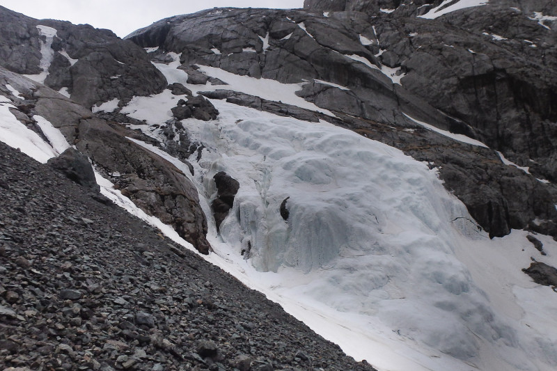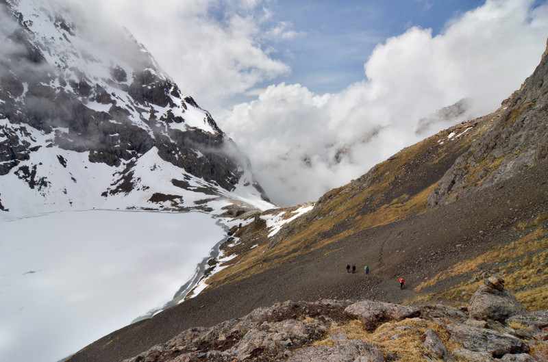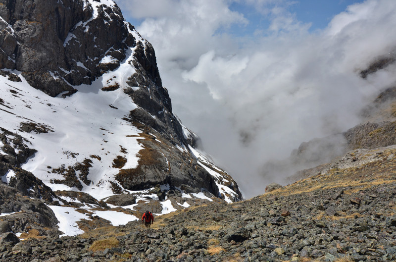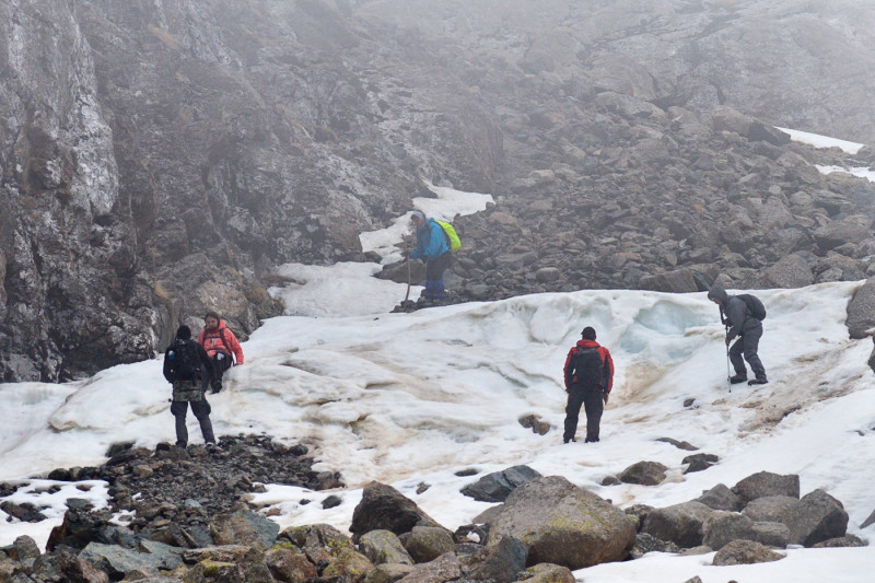 В самом начале подъема столкнулись с идущим навстречу одиноким туристом, оказавшимся испанцем, с большим трудом изъясняющимся по-английски. Я так и не понял, откуда он шел, и где ночевал. Благородный дон поведал нам, что озеро под снегом, и идти до него примерно четыре часа. Обнадежил, блин! )) Поскольку ничего полезного у него выпытать больше не удалось, за сим и распрощались. До конца дня не встретили больше ни души.