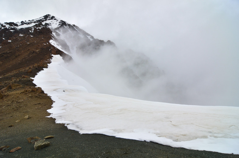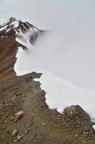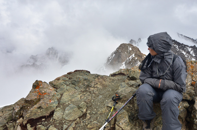 Ощущение, что дошли до края земли - вот оно, ребро хребта, вот каменистый склон, по которому мы сюда поднялись, а дальше ничего нет - молоко. Белая завеса. Строго по оси хребта. Видать, ущелье Кёльдике нам сегодня не покажут. А может, подождать? Почему бы нет, небольшой запас по времени еще есть. Скрашивая долгие минуты ожидания, народ немедленно предался прелестям перевальной фотосессии. Все-таки в низкой облачности (особенно, если она лишь с одной стороны хребта) определенно есть своя прелесть!