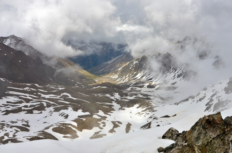 Через какое-то время ветер немного разогнал подперевальные облака, и нашему взору предстала вполне симпатичная картина раскинувшегося внизу ущелья, вознаградив нас за терпеливое ожидание! Правда, длилась она считанные минуты, после чего снова все затянуло. Похоже, таким образом нам мягко намекали сверху, что пора пускаться в обратный путь, если хотим успеть вернуться в лагерь засветло. Путь предстоял не близкий, и мы немедленно приступили к спуску.