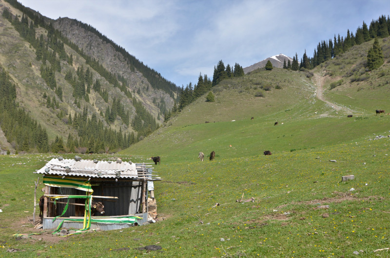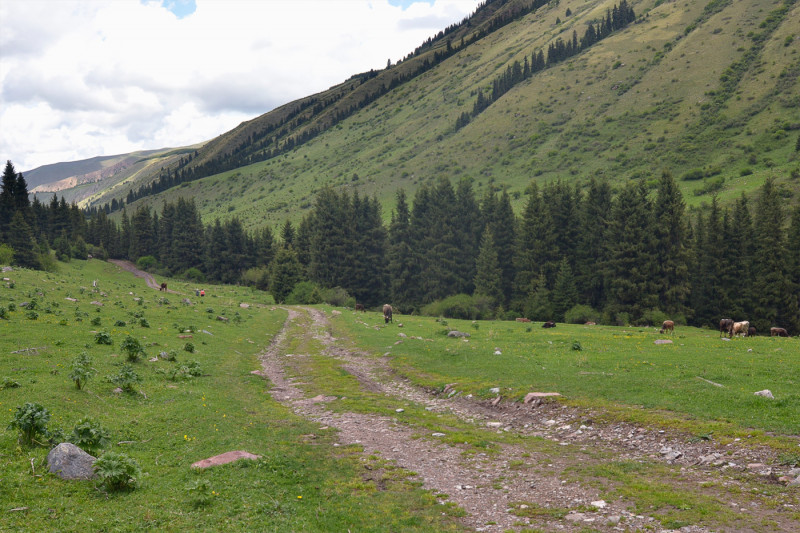 Начать решили с водопадов. Как ни странно, от трассы и вплоть до перемычки с Григорьевским ущельем (через перевал Кок-Бель) дорога асфальтированная. Вдоль дороги тянется ЛЭП, и вообще, ущелье выглядит куда более обжитым. Как позже выяснилось, за турбазой Кырчын имеется еще и поселок (довольно крупный) Кырчын. Теперь понятно, почему дорога хорошая ) По сторонам дороги - пастбища с пасущимся скотом.
