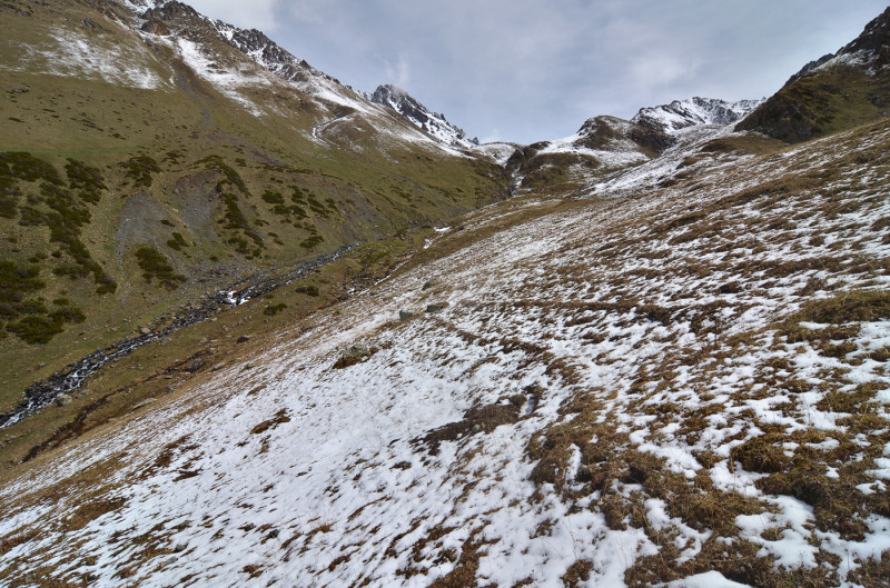 К тому времени как я догнал Катю, ребята уже были далеко, и достигли довольно мощного и крутого снежника на противоположном склоне ущелья, ведущего на плато, с которого можно попасть на перевал Телеты (увы, похоже, что и с этой стороны он заснежен). Они явно собирались его штурмовать, хотя по времени было понятно, что до перевала дойти уже не успеваем - через полчаса пора уже поворачивать вспять. Катя, поснимав окрестные заснеженные пейзажи, тоже решила возвращаться в лагерь, не дожидаясь остальных. Карабкаться по снежникам явно не входило в ее планы ). Сам же решил дождаться народ, попробовав подняться максимально высоко по этой стороне ущелья и поискав еще что-нибудь интересное из флоры. Для этой цели я одел гамаши, и спокойно начал подъем по сугробам.