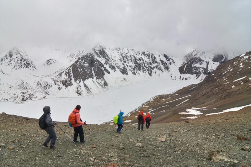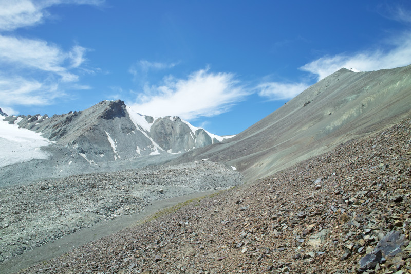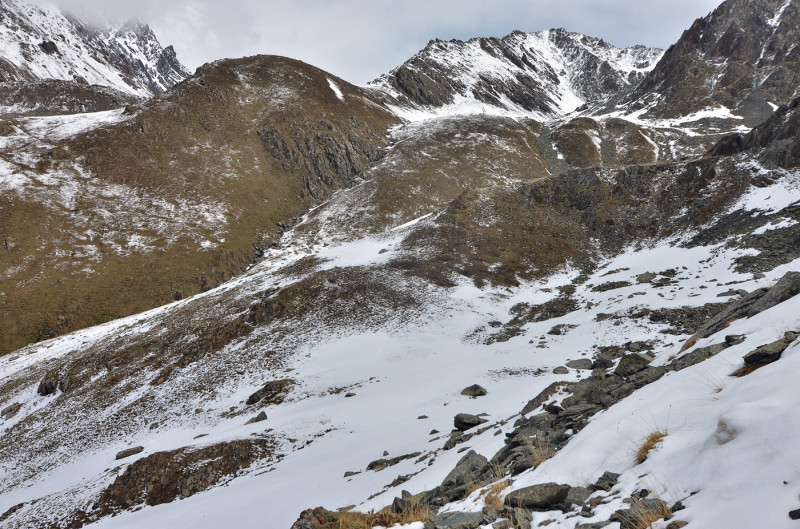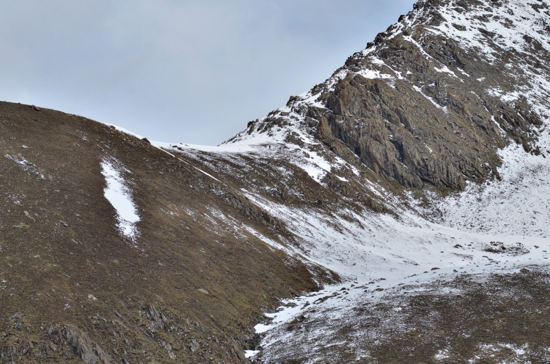 Путь до перевала показался каким-то нескончаемым. Тропа траверсировала осыпной склон горы в двухстах метрах над северным берегом озера, то сбрасывая, то снова набирая высоту, в итоге вместо четырехсот метров суммарный набор составил, наверное, раза в два больше. Местами приходилось преодолевать небольшие снежники - где-то снег держал наш вес, а где-то проваливались в него по колено и выше. В целом, дорога несложная, лишь в конце немного утомительная, на крутом взлете перед самым перевалом. Да вот еще в одном месте чуть не угодили под камнепад. Шел первым, отыскивая глазами тропу, остальные на некотором удалении позади. Вдруг прямо над головой раздался грохот, и открылось незабываемое зрелище, как сверху со склона на меня летят, кувыркаясь и сшибая все на своем пути, огромные каменюки. Наверное, мог бы получится классный кадр, но, к сожалению, времени не было даже на то, чтобы просто постоять полюбоваться мощью стихии - пора было делать ноги! Быстренько отбежав назад по тропе и дождавшись, пока все успокоится, пошел было вперед, но выяснилось, что женская часть группы не слишком жаждет следовать за мной и с опаской поглядывает вверх. Кто-то даже предложил вернуться, типа "ну нафиг этот перевал, жизнь дороже", и мне стоило немалых усилий убедить взволнованную общественность продолжить путь - дескать, все нормально, самая сложная часть дороги позади, камнепадов больше не будет, и вообще до перевала уже рукой подать.