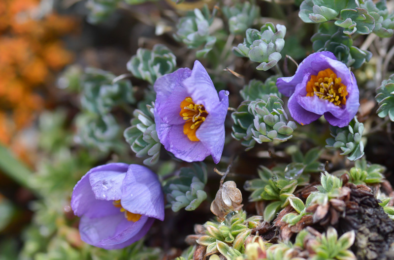 Маше внезапно занездоровилось, и она, немного отдохнув, решила повернуть обратно в лагерь. Я же побежал догонять остальных, но едва вышел из зоны кустарников, как меня снова тормознули - на этот раз пейзажные виды. Одна сторона травянистого склона была покрыта рваными полосами снега, создающими интересную текстуру ряби, кроме того, среди этих сугробиков тут и там росли Купальницы лиловые - ну вот и как тут пройдешь мимо!
