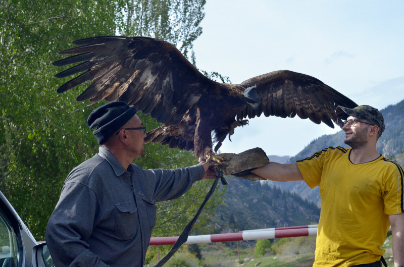 Самое известное из ущелий северного Прииссыккулья, расположено в хребте Кюнгей-Ала-Тоо ("Пестрые горы, обращенные к солнцу"), относящемуся к северному Тянь-Шаню. Где-то даже читал, что считается красивейшим ущельем на Иссык-Куле, но с этим можно было бы и поспорить. Въезд в ущелье начинается от поселка Григорьевка, находящегося дальше по трассе, километрах в 30 от Чолпон-Аты. Раньше въезд в него был платным, теперь же плату отменили, но шлагбаум с кабинкой остались Причем, шлагбаум всегда закрыт. К останавливающимся перед ним машинам из кабинки бодренько выбегает киргиз с беркутом на руке и настойчиво предлагает пофоткаться. Чуя подвох, сразу спрашиваю: "почем?" - "всего 200 сом!". Вежливо уклоняюсь, но среди прочих участников группы, разумеется, сразу же находятся желающие запечатлеться с беркутом, поэтому въезд в ущелье, хоть и таким вот необычным способом, но продолжает оставаться платным (по крайне мере, для русских и иностранцев) )